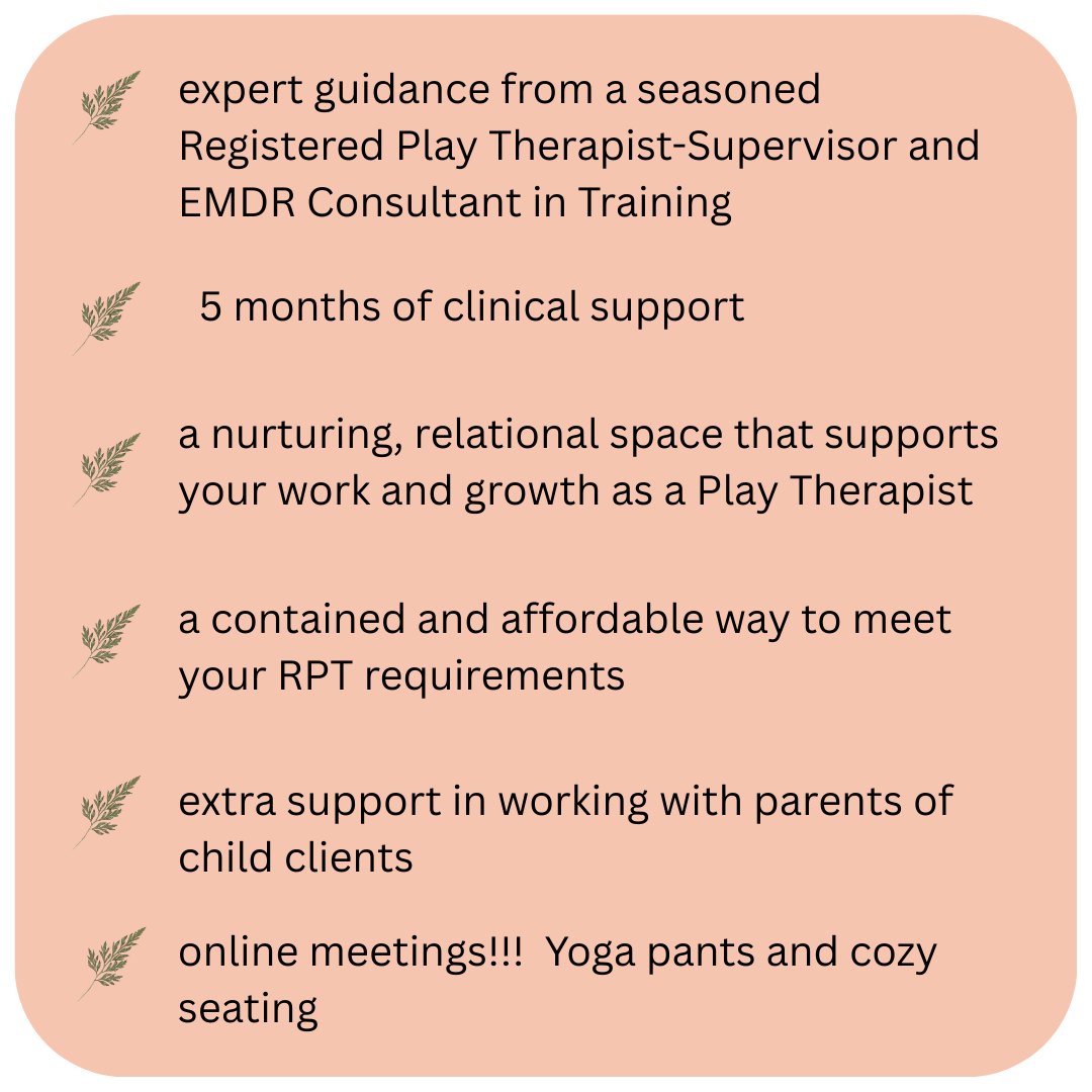Supervision integrates Child Centered Play Therapy, Attachment Theory, TraumaPlay™ Therapy, Sandtray Therapy, and EMDR Therapy (when applicable).